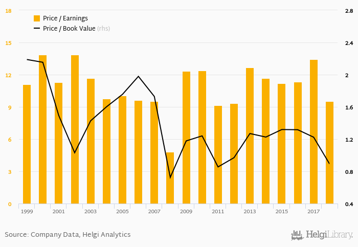 In terms of price to book value, the stock reached 0.891x at the end of 2018. Since 2013, the multiple reached an all time high of 1.32x in 2015 and an all time low of 0.891x in 2018 with an average of 1.20x.