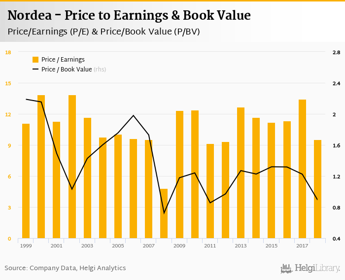 At the end of 2018, the bank traded at price to earnings of 9.53x. Within the last five years, the multiple reached an all time high of 13.4x in 2017 and an all time low of 9.53x in 2018 with an average of 11.4x.