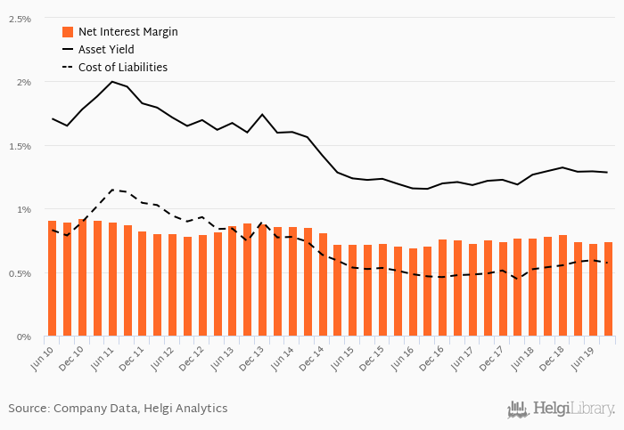Historically, the bank’s net interest margin reached an all time high of 0.924% in 4Q2010 and an all time low of 0.696% in 2Q2016. The average margin in the last six quarters amounted to 0.762%.