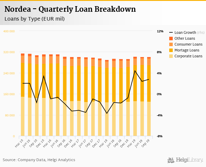 Mortgage loans represented 46.1% of the bank's loan book at the end of the year 3Q2019, consumer further 8.62% and corporate loans 43.4% of total loans.