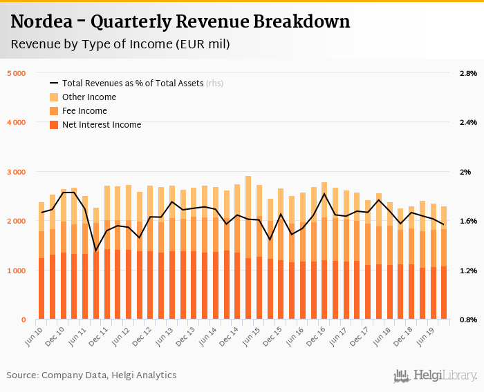 Nordea generated total banking revenues of EUR 2,292 mil in the third quarter of 2019, up 1.78% when compared to the same period of last year and down 2.39% when compared to the previous quarter.