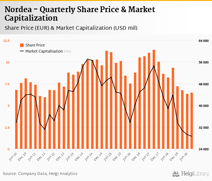 Nordea stock traded at EUR 6.51 per share at the end of third quarter of 2019 implying a market capitalization of USD 28,624 mil.