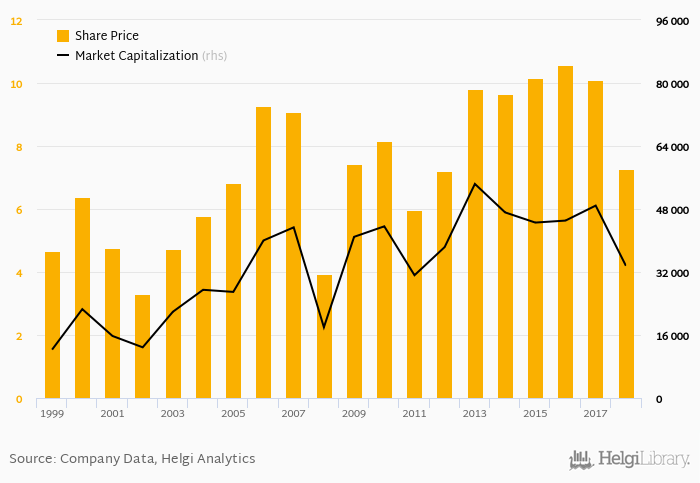 Since the end of 2013, the stock has depreciated by -25.9 % implying an annual average growth of -5.83 %. In absolute terms, the value of the company fell by USD -20,788 mil.