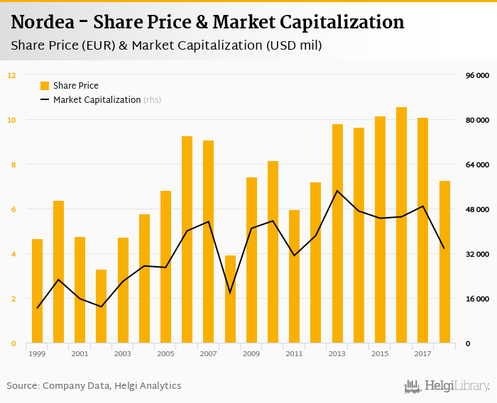 Nordea stock traded at EUR 7.27 per share at the end of 2018 implying a market capitalization of USD 33,582 mil.