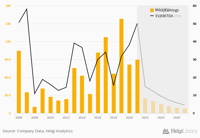 In terms of EV/EBITDA, stock traded at 50.2x at the end of 2021. Since 2016, stock has traded between 15.5x and 50.2x with an average of 33.9x.