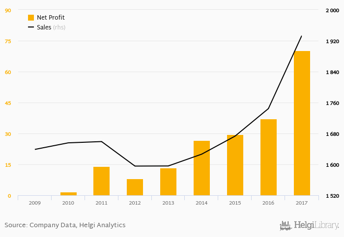 Sales have grown by 3.91% a year on average since 2012. They reached a high of CZK 1,933 mil in 2017 and a low of CZK 1,596 mil in 2012.