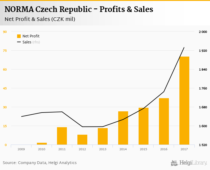 NORMA Czech Republic made a net profit of CZK 70.2 mil in 2017, up 89.5% compared to the previous year. Total sales reached CZK 1,933 mil, which is up 10.8% when compared to the previous year.