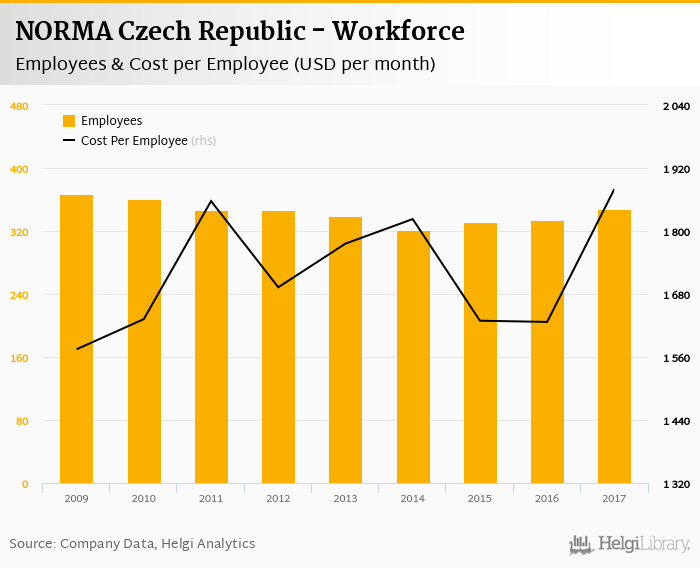 NORMA Czech Republic employed 348 employees in 2017, up 4.19% compared to the previous year. Historically, between 2009 and 2017, the firm's workforce hit a high of 367 employees in 2009 and a low of 321 employees in 2014.