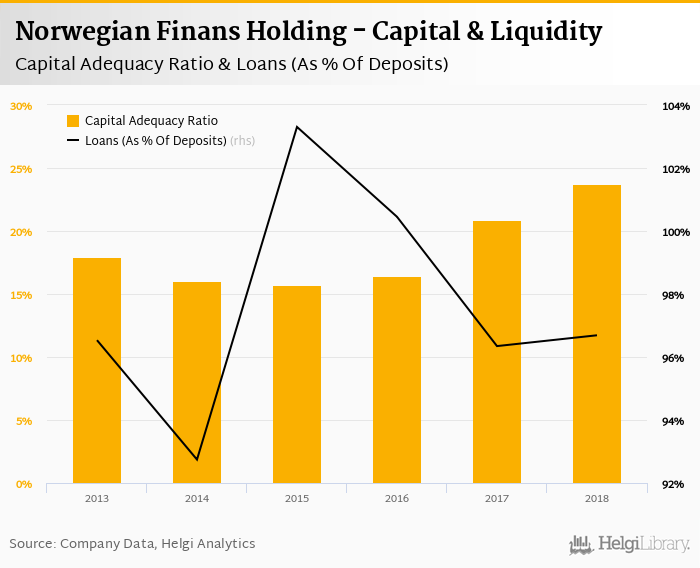 Norwegian Finans Holding's capital adequacy ratio reached 23.7% at the end of 2018, up from 20.9% compared to the previous year. Historically, the bank’s capital ratio hit an all time high of 23.7% in 2018 and an all time low of 15.7% in 2015.