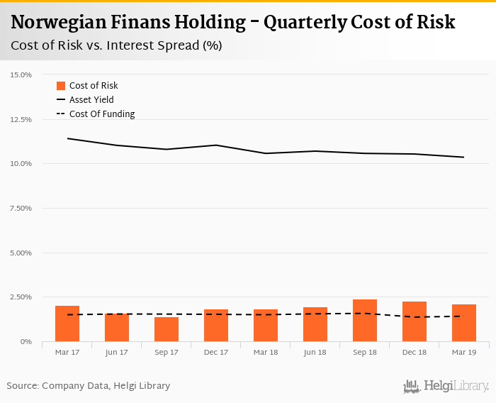 Norwegian Finans Holding's Cost of Risk (loan loss provisions as % of total assets) amounted to 2.11% in the first quarter of 2019, down from 2.26% when compared to the previous quarter.