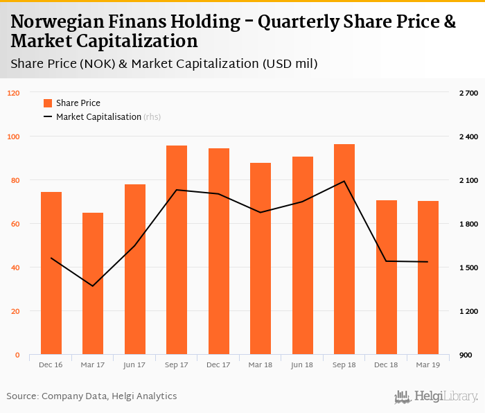 Norwegian Finans Holding stock traded at NOK 70.5 per share at the end of first quarter of 2019 implying a market capitalization of USD 1,534 mil.