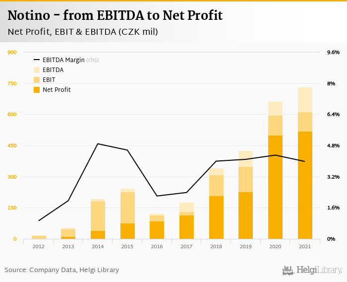 Notino made a net profit of CZK 519 mil with revenues of CZK 18,426 mil in 2021, up by 3.85% and up by 19.8%, respectively, compared to the previous year. This translates into a net margin of 2.82%.