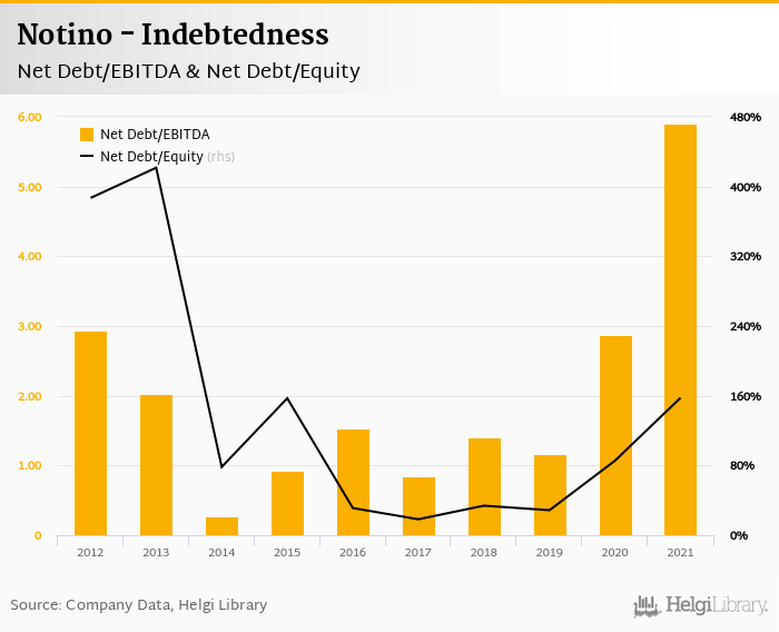 Notino's net debt stood at CZK 4,327 mil and accounted for 158% of equity at the end of 2021. The ratio is up 72.1 pp compared to the previous year.