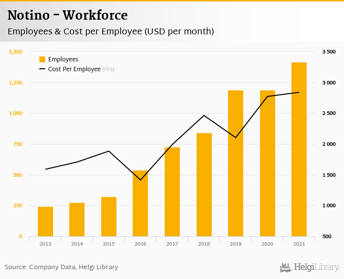 Notino employed 1,417 employees in 2021, up 19.3% compared to the previous year. Historically, between 2013 and 2021, the firm's workforce hit a high of 1,417 employees in 2021 and a low of 242 employees in 2013.