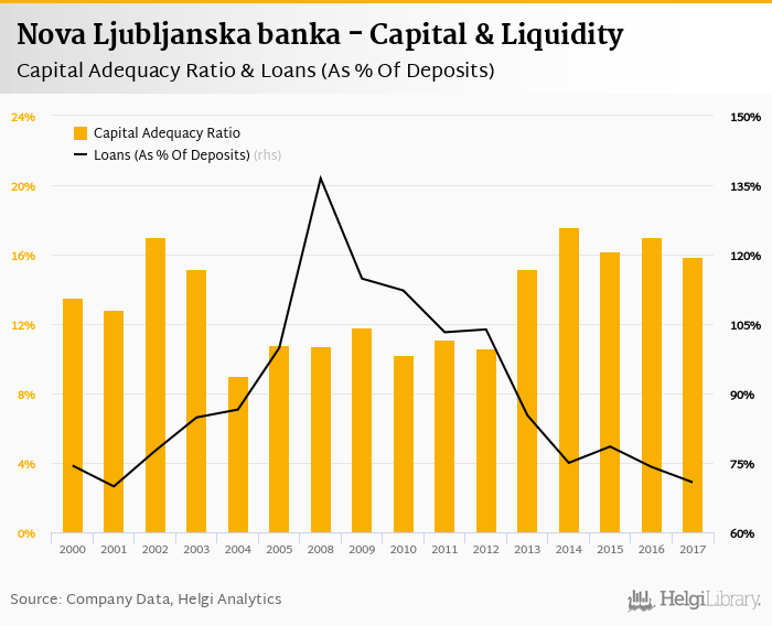 Nova Ljubljanska banka's capital adequacy ratio reached 15.9% at the end of 2017, down from 17.0% compared to the previous year. Historically, the bank’s capital ratio hit an all time high of 17.6% in 2014 and an all time low of 9.00% in 2004.