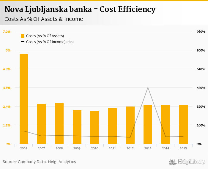 Comparing Nova Ljubljanska banka with its closest peers, UniCredit Bank Slovenia operated in 2015 with a cost to income ratio of 53.3% in 2015, NKBM Group reached 62.7% and SKB Banka some 53.0%.