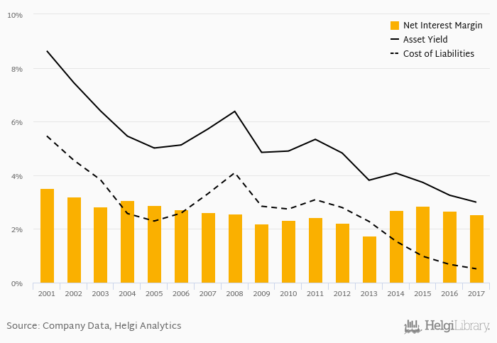 Historically, the bank’s net interest margin reached an all time high of 3.53% in 2001 and an all time low of 1.74% in 2013. The average margin in the last five years amounted to 2.50%.