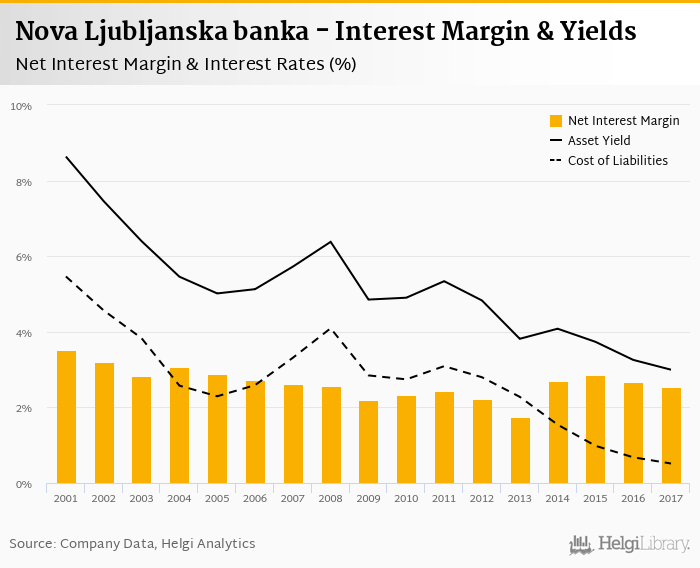 Comparing Nova Ljubljanska banka with its closest peers, UniCredit Bank Slovenia operated in 2017 with a net interest margin of 1.73% in 2017, NKBM Group reached 1.69% and SKB Banka some 2.55%.