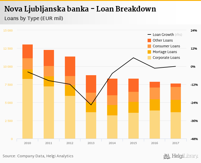 Nova Ljubljanska banka's loans reached EUR 7,641 mil in the 2017, down from EUR 7,901 mil compared to the previous year. Historically, the bank’s loans reached an all time high of EUR 13,054 mil in 2010 and an all time low of EUR 7,641 mil in 2017.
