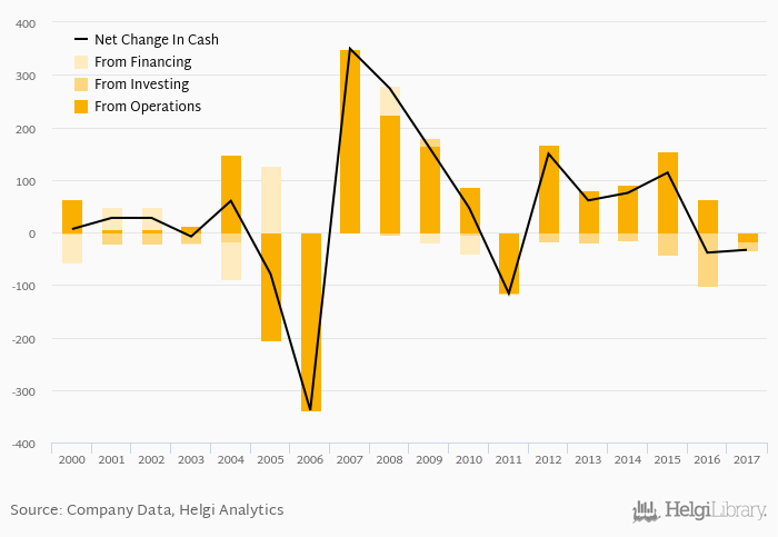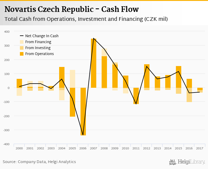 Cash from financing amounted to CZK 0 mil, so the company generated CZK -33.2 mil net cash in 2017.