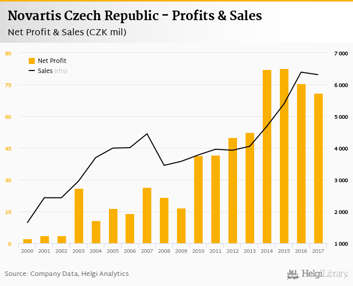 Novartis Czech Republic made a net profit of CZK 71.0 mil in 2017, down 6.08% compared to the previous year. Total sales reached CZK 6,312 mil, which is down 1.25% when compared to the previous year.