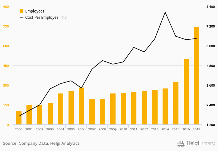 Staff cost represented of sales in 2017, 0 pp higher than a decade ago.