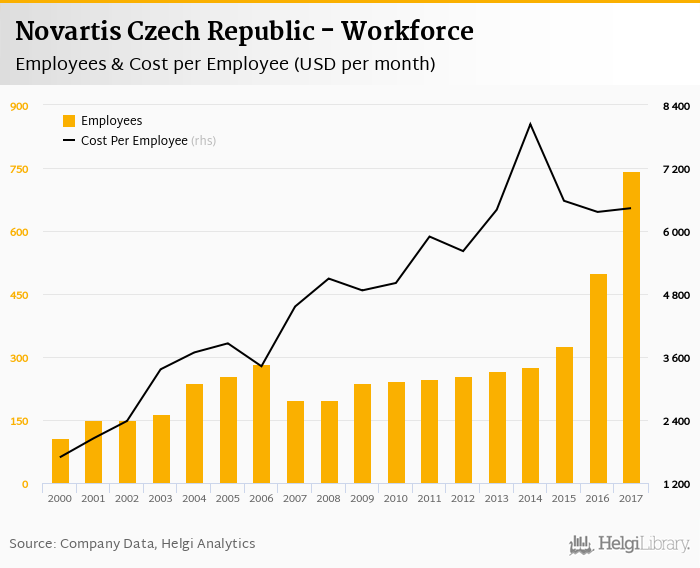 Novartis Czech Republic employed 743 employees in 2017, up 48.3% compared to the previous year. Historically, between 2000 and 2017, the firm's workforce hit a high of 743 employees in 2017 and a low of 108 employees in 2000.