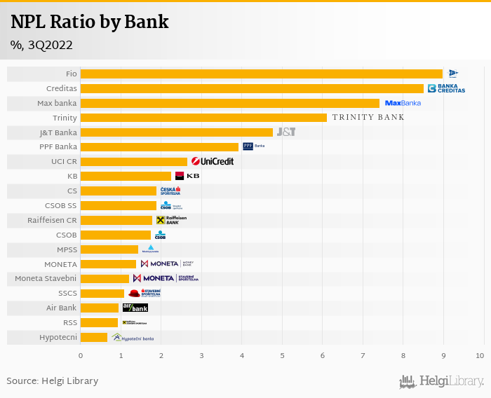 Hypotecni Banka operated with the highest-quality performing loan portfolio - only 0.675% of loans were not performing at the end of September 2022. On the other hand, Fio banka reported the highest NPL ratio with 8.98%.