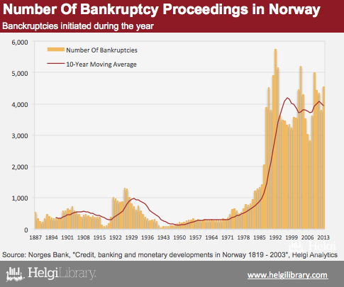 There were some 4,564 bankruptcy proceedings initiated in Norway in 2013, according to the data provided by the National Statistical Office. This is the 6th highest number since 1887 and 15.5% above the average seen in the last decade.