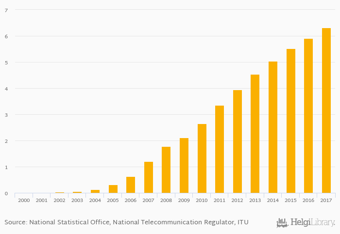 Number of fixed broadband internet connections rose 6.87% to 6.32 mil in Colombia in 2017, according to World Bank.