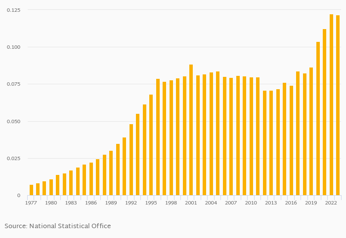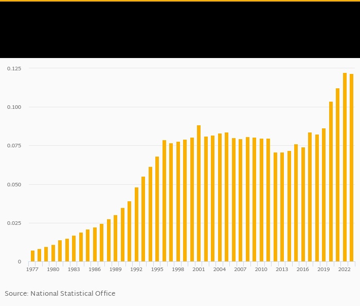 Number of fixed lines fell 0.315% to 0.122 mil in Brunei in 2023, according to World Bank.