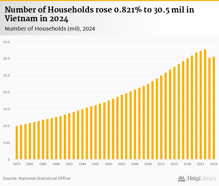 Historically, number of households in Vietnam reached an all time high of 32.8 mil in 2022 and an all time low of 9.98 mil in 1979.