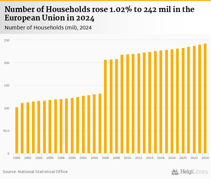 Number of households rose 1.02% to 242 mil in the European Union in 2024, according to the National Statistical Office.