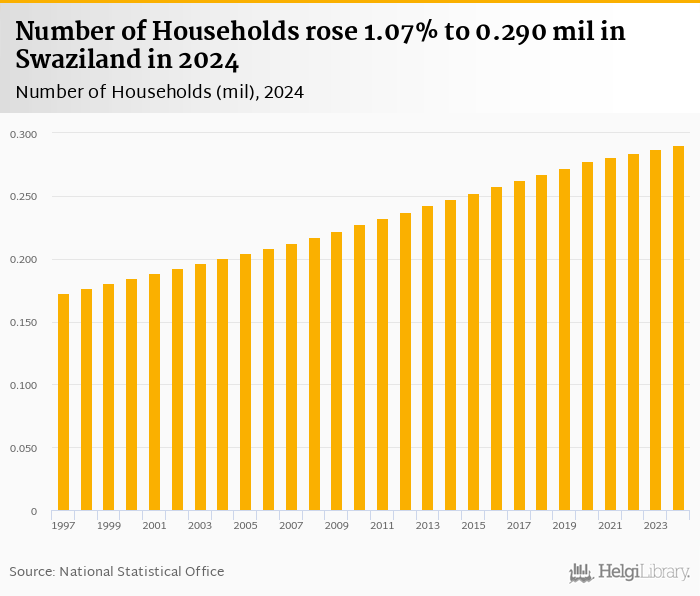 Number of households rose 1.07% to 0.290 mil in Swaziland in 2024, according to the National Statistical Office.