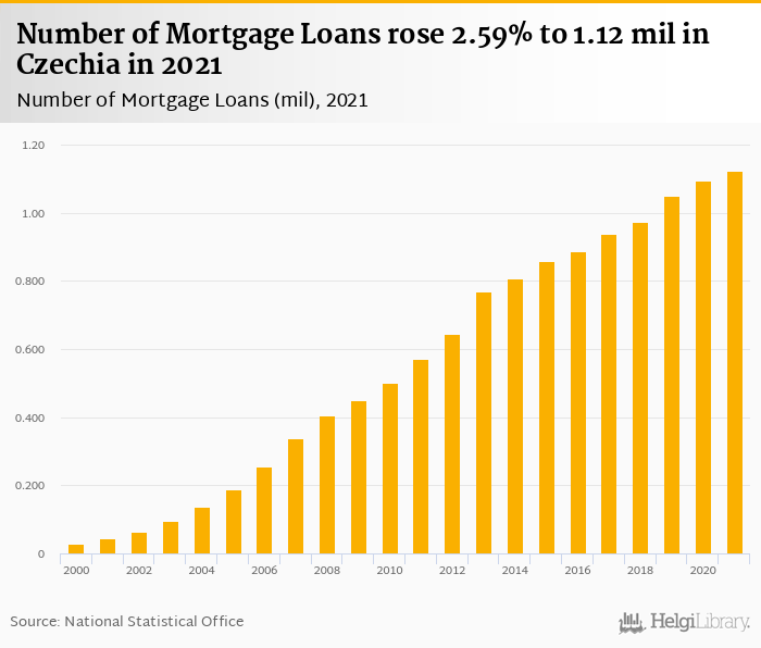 Number of mortgage loans rose 2.59% to 1.12 mil in Czechia in 2021, according to the National Statistical Office.