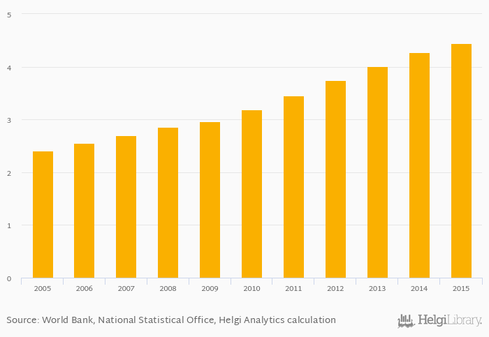Historically, number of motor vehicles in Chile reached an all time high of 4.44 mil in 2015 and an all time low of 2.41 mil in 2005. When compared to Chile's main peers, number of motor vehicles in Argentina amounted to 13.7 mil, 0.770 mil in Bolivia, 0.653 mil in Paraguay and 0.960 mil in Uruguay in 2015.
