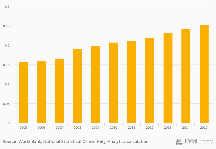 Number of motor vehicles rose 4.56% to 0.252 mil in Benin in 2015, according to the National Statistical Office.