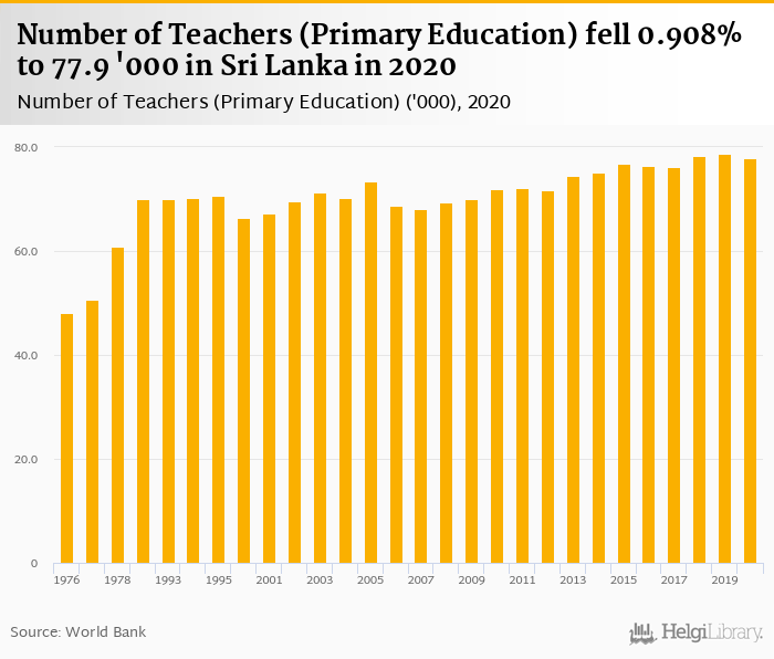 Number of teachers in primary education fell 0.908% to 77.9 '000 in Sri Lanka in 2020, according to World Bank.