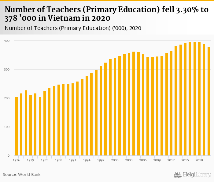 Number of teachers in primary education fell 3.30% to 378 '000 in Vietnam in 2020, according to World Bank.