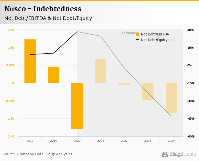 Nusco's net debt stood at EUR 3.60 mil and accounted for 28.4% of equity at the end of 2020. The ratio is up 18.2 pp compared to the previous year.