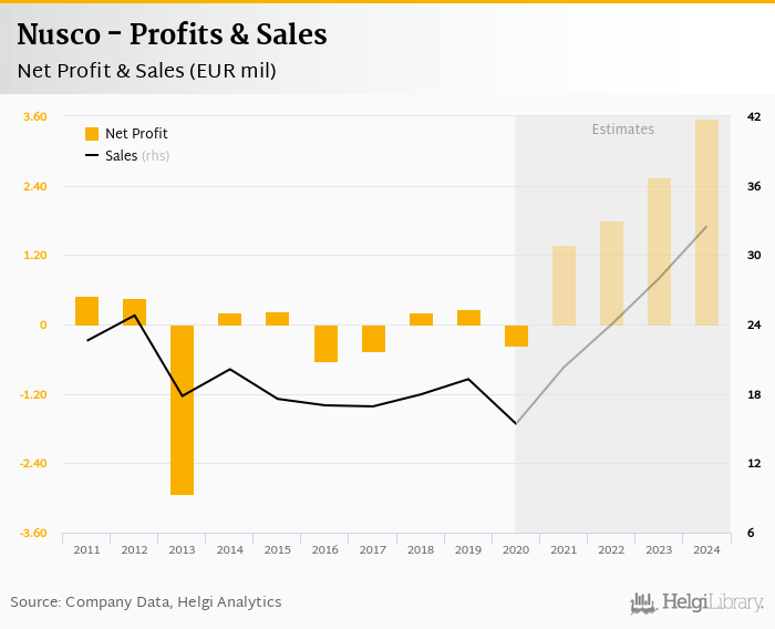 Nusco made a net profit of EUR -0.364 mil in 2020, down 239% compared to the previous year. Total sales reached EUR 15.4 mil, which is down 20.1% when compared to the previous year.