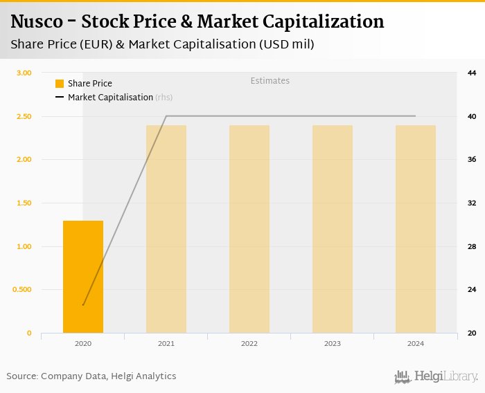 Nusco stock traded at EUR 1.30 per share at the end 2020 implying a market capitalization of USD 22.5 mil.