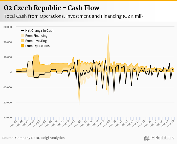 Cash from financing amounted to CZK -168 mil, so the company generated CZK 1,193 mil net cash in 1Q2020.