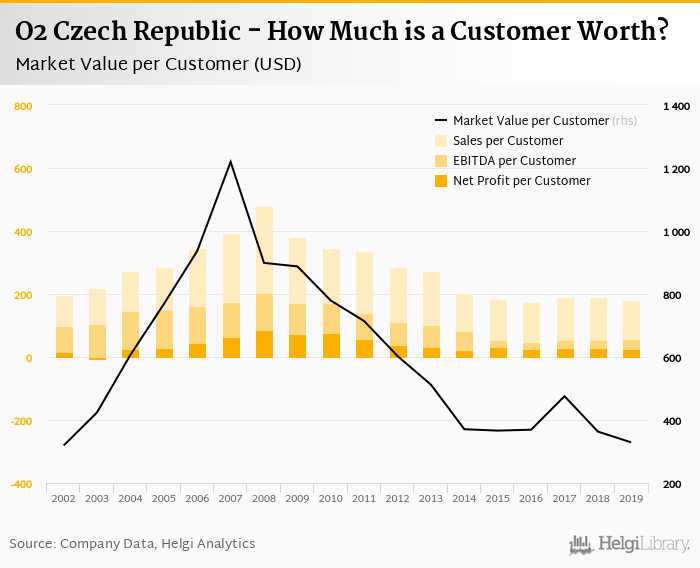 A simple comparison of O2 Czech Republic’s sales with a number of its customers reveals that the average customer brought the firm USD 182 revenue in 2019, down 10.5% compared to 2014, for example. In terms of profitability, a single client generated EBITDA of USD 56.4 and a net profit of USD 25.6 in 2019.