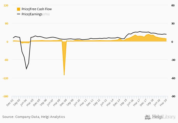 At the end of 1Q2020, the firm traded at price to earnings of 11.8x. Over the last five years, this multiple achieved a high of 16.4x in 1Q2017 and a low of 4.55x in 2Q2015 with an average of 13.2x.