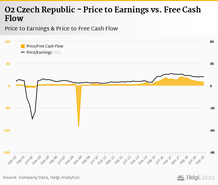 Regarding cash generated defined by the sum of net profit and depreciation, the stock traded at 6.53x at the end of 1Q2020. When investments are excluded to get free cash flow, O2 Czech Republic traded at 8.90x.