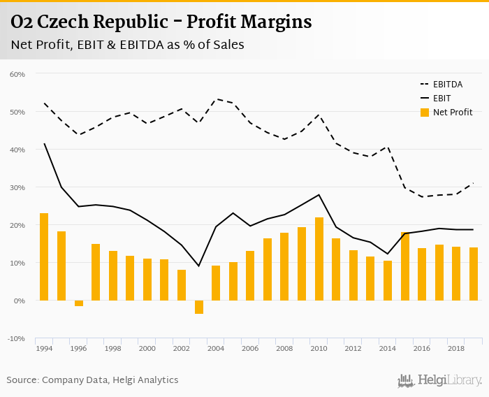 O2 Czech Republic made a net profit of CZK 5,463 mil with revenues of CZK 38,920 mil in 2019, up by 0.239% and up by 1.88%, respectively, compared to the previous year.