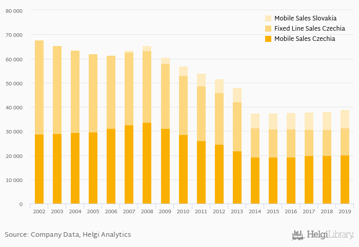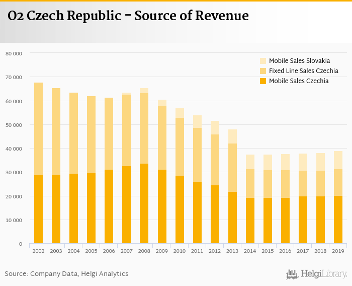 Overall, O2 Czech Republic’s sales have been falling by an average 4.22% a year in the last 10 years. At the end of 2019, O2 Czech Republic served total of 7.60 mil customers in the Czech Republic and in Slovakia.