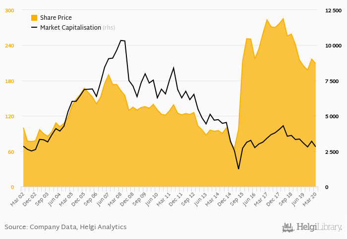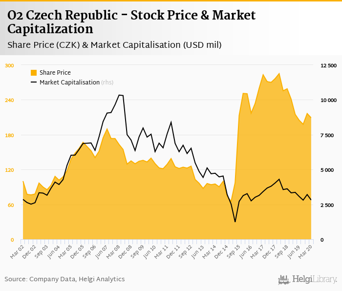O2 Czech Republic stock traded at CZK 209 per share at the end 1Q2020 implying a market capitalization of USD 2,813 mil.
