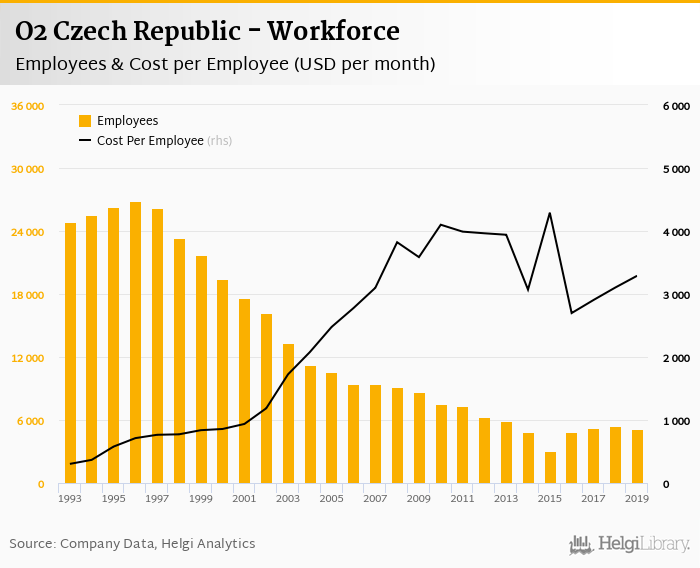 O2 Czech Republic employed 5,116 employees in 2019, down 4.92% compared to the previous year. Historically, between 1993 and 2019, the firm's workforce hit a high of 26,888 employees in 1996 and a low of 3,005 employees in 2015.